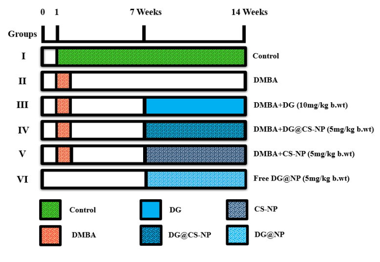 The animals were randomly allocated into experimental and control groups and segmented into six groups comprising six animals each (fig. 1). Animals from Group I will be served as the control. During the first week of the experiment, Groups II-V will receive a single subcutaneous injection of 25 mg/kg b. wt DMBA. After 7 w, Groups III and IV will be medicated with DG and DG@CS-NP at 10 mg/kg b. wt and 5 mg/kg b. wt, respectively, thrice a week, orally. Groups V and VI will be supplied with CS-NP and free DG@NP at the concentrations of 5 mg/kg b. wt, thrice a week (21 d), orally. The dosage applied in the current study is based on earlier analyses [20, 21]. The experiment was terminated at the end of 14 w, and all the rats were sacrificed. The tissues were promptly dissected, washed thoroughly with ice-cold saline, and were preserved in 10% formalin, paraffin-imgded, partitioned, and fixed on polylysine-coated glass slides for immunohistochemical staining.