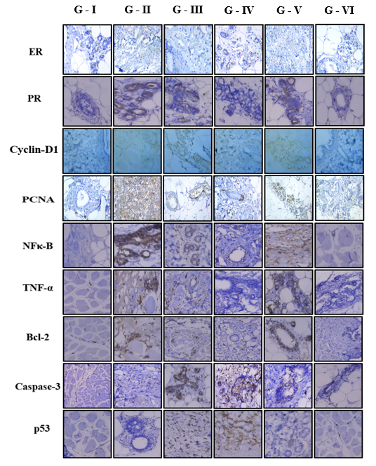 Fig. 2: Immunohistochemical expressions of ER, PR, Cyclin D1, PCNA, NF-κB, TNF-α, Bcl-2, Caspase-3, p53