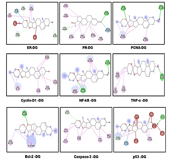Fig. 4: 2-D interactions of diosgenin with active breast cancer targets