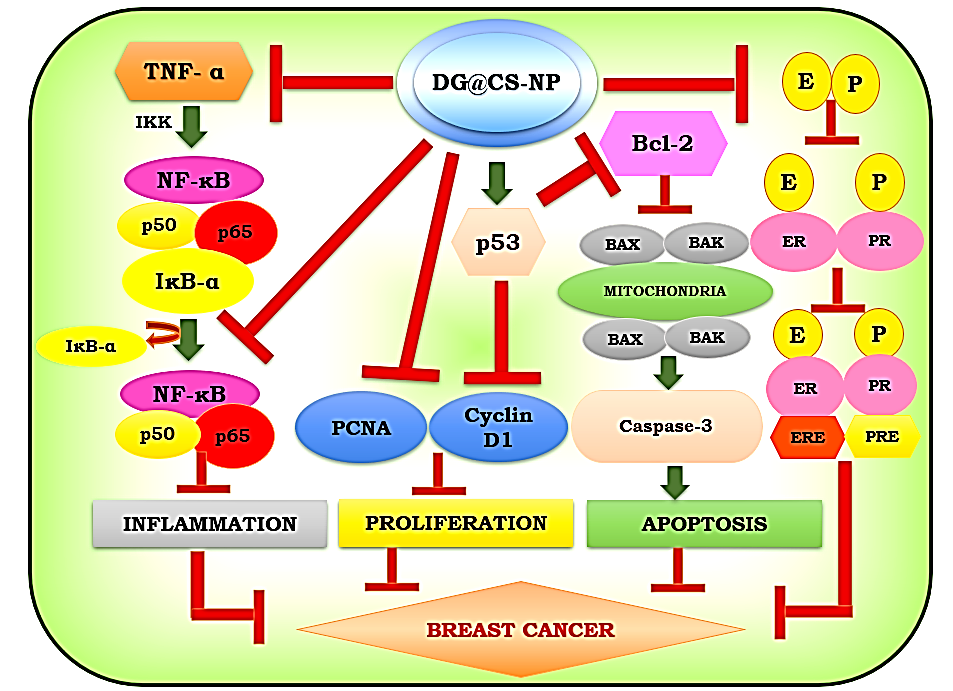 In conclusion, the entire analysis strongly validates the antiproliferative, anti-inflammatory, and apoptotic impacts of DG@CS-NP in breast cancer therapy via downregulating ER, PR, cyclin-D1, PCNA, TNF-α, NF-κB, and Bcl-2 expressions along with the upregulation of Caspase-3 and p53 expressions. Both immunohistochemical expressions and molecular docking provide convincing proof that DG@CS-NP holds remarkable therapeutic potentials thereby it acts as a promising breast cancer chemotherapeutic candidate.