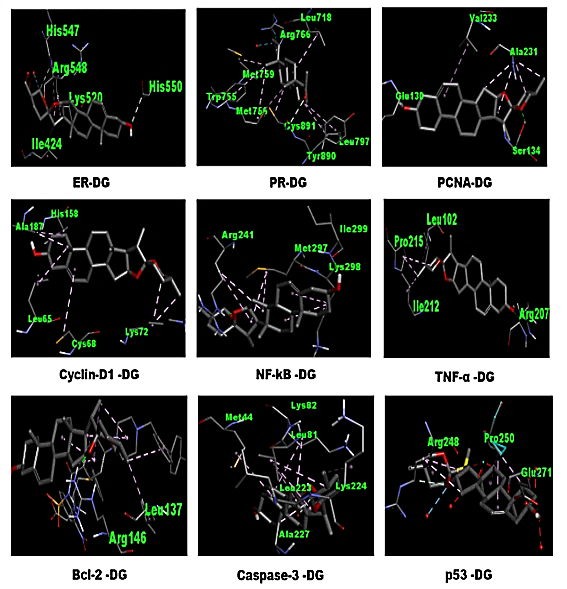 We employed bioinformatics approaches to uncover the binding sites of DG that validate its interactions with all these BC targeted proteins (ER, PR, Cyclin D1, PCNA, NF-κB, TNF-α, Bcl-2, Caspase-3, p53). Docking analyses proved that DG strongly interacts with these catalytic domains via a plethora of interacting core residues that sit in these active interactions with significant binding affinity. From the docking studies, we found that DG has the best binding scores with ER (-9.95 kcal/mol) with active residues Ile 424, Lys 520, His 547, Arg 548, His 550 and also shows good affinity with PR (-8.35 kcal/mol) with Leu 718, Trp 755, Met 756, Met 759, Arg 766, Leu 797, Tyr 890, Cys 891 as key participants. In the DG-Cyclin D1 complex, it poses-8.40 kcal/mol binding energy with key residues Leu 65, Cys 68, Lys 72, His 158, Ala 187. Similarly, in DG-PCNA complex, it shows-8.73 kcal/mol binding energy with Glu 130, Ser 134, Ala 231, Val 233 as major participants. In DG-NF-κB interactions, it shows-8.30 kcal/mol binding energy and the key residues interacted are Arg 241, Met 297, Lys 298, Ile 299. Thus, in complex with TNF-α, DG shows-8.52 kcal/mol binding energy with core residues Leu 102, Arg 207, Ile 212, Pro 215. Along with Bcl-2, DG shows-9.06 kcal/mol binding energy with Leu 137, Arg 146 interactive residues. DG-Caspase3 complex shows-8.65 kcal/mol binding energy with active residues Met 44, Leu 81, Lys 82, Leu 223, Lys 224, Ala 227. DG in complex with p53 possesses-7.79 kcal/mol as binding energy with Arg 248, Pro 250, Glu 271 as core participants. These data lend an approval for DG's active interactions with these BC targets, respectively (fig. 3 and fig. 4). Moreover, such outcomes are well congruent with immunohistochemical responses.