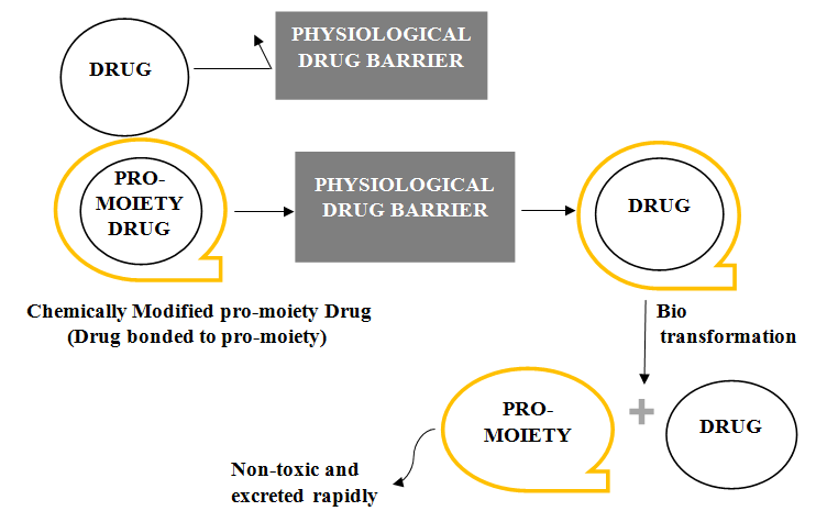 It's easy to get confused between prodrugs, soft drugs (also known as ante drugs), and codrugs (also known as mutual drugs), but each category is structured with different purposes in mind. Soft drugs, unlike prodrugs, are pharmacologically active molecules that are quickly transformed to a less pharmacologically active or even fully inactive type once administered. Soft drug therapies are often used to target particular tissues (such as the eye, skin, or lungs) in order to reduce overall systemic exposure and Adverse Drug Reactions (ADRs) [3]. By modulating physicochemical properties that influence absorption or targeting particular enzymes or membrane transporters, the prodrug approach has been commonly used to enhance drug delivery to their site of action [4]. To be translated into the parent drug, most of the prodrugs currently in clinical use need enzymatic catalysis. The prodrugs that are intended to release the parent drug into the bloodstream after GI absorption comes under this category. These are especially ester derivatives of drugs with carboxyl or hydroxyl groups that are easily converted to the parent drug by hydrolysis with the help of the enzyme esterase [5]. Prodrugs are physiologically inactive analogues of parent drug that needs a chemical or enzymatic modification within the body to liberate the active drug and have better delivery than the parent moiety [6]. Typically, enzymatic or non-enzymatic cleavage occurs to cleave the pro-moiety bonds. Fig. 1 elucidates the concept of the prodrug. High chemical reactivity that hinders the regeneration of the parent drug occurs while incorporating the process of enzymatic cleavage. So, an unconventional approach of non-enzymatic cleavage has been emerged to regenerate the parent drug in which the prodrug activation is not induced by inter and intra-individual variability rather by the process of cyclization [7].