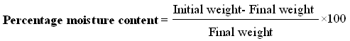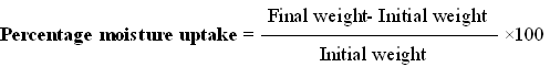 The gauged patches were kept in a desiccator at room temperature for 24 h containing a soaked arrangement of potassium chloride [34] to keep up 84% RH. After 24 h the movies are to be rechecked and decide the rate dampness take-up from the beneath referenced equation.