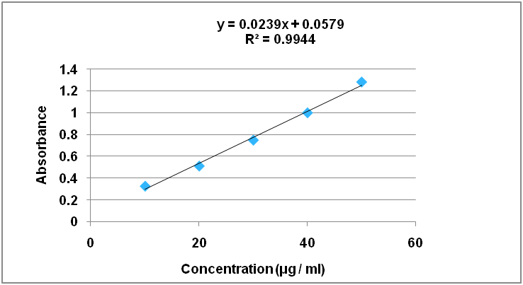 The above stock arrangement filtered for the most extreme absorbance utilizing UV max of eplerenone in phosphate buffer pH 6.8 was seen as 245 nm [11, 12]. The above stock arrangement (100 g/ml) was additionally weakened to get focus in the range of 10-50 g/ml. The absorbance of every arrangement was estimated utilizing a UV-Visible double beam spectrophotometer by putting reference standards of a particular medium. The standard bend produced for a whole range of conc. and the tests acted in triplicate.