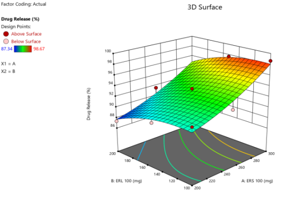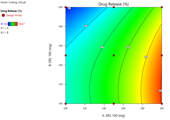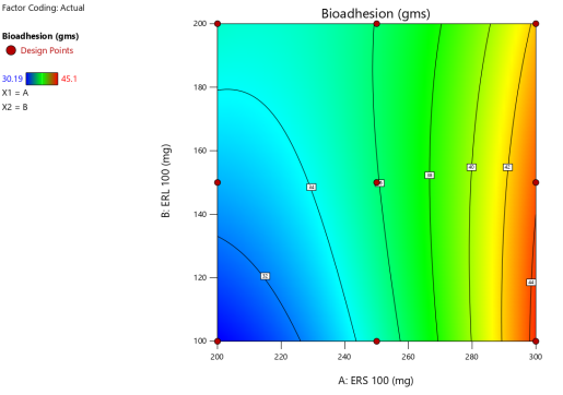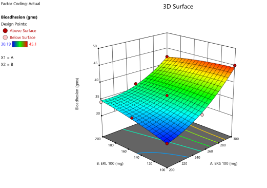 Fundamental preliminary batches were arranged and assessed for the determination of different centralizations of polymers, plasticizers, and permeation enhancers. After-effects of fundamental preliminary clusters proposed that batches arranged with ERS and ERL 100 [20] show great mechanical properties however, helpless adhesive properties. 32 full factorial structures were select from Design Expert programming 9.0 for the advancement of conclusive detailing. This plan included three dependent variables (Y1, Y2, and Y3) or more referenced two independent variables (X1 and X2). The needy factors Y1 was rigidity (BS) of arranged patches, Y2 was drug release in the introductory first hour (Q1h) and Y3 was medicated discharge following 16 h (Q16h) [16, 19, 20].