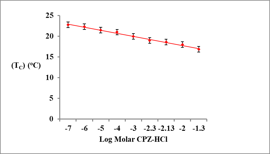 Fig. 1: Changes in phase transition (Tc) of CPZ-HCl/DMPC (10% W/V) liposomes in phosphate buffer (pH 6.0). The values obtained were the mean of three experiments (n= 3). SDs are shown as error bars and all values were in the range of+0.01-0.02