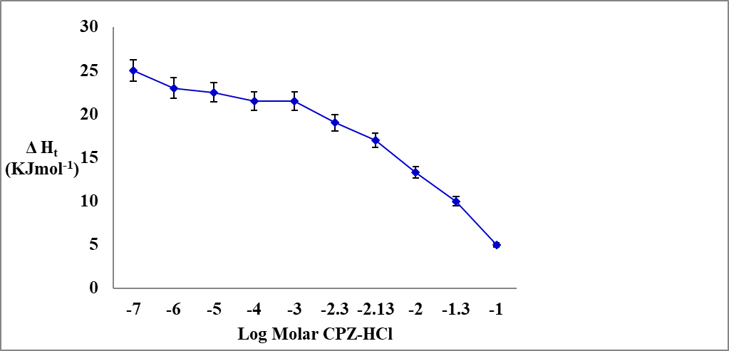 Fig. 2: Changes in the enthalpies of transition (∆Ht) of 10% W/V DMPC liposomes as a function of log molar CPZ-HCl in phosphate buffer (pH 6.0). The values obtained were the mean of three experiments (n= 3). SDs are shown as error bars and all values were in the range of+0.2-0.8