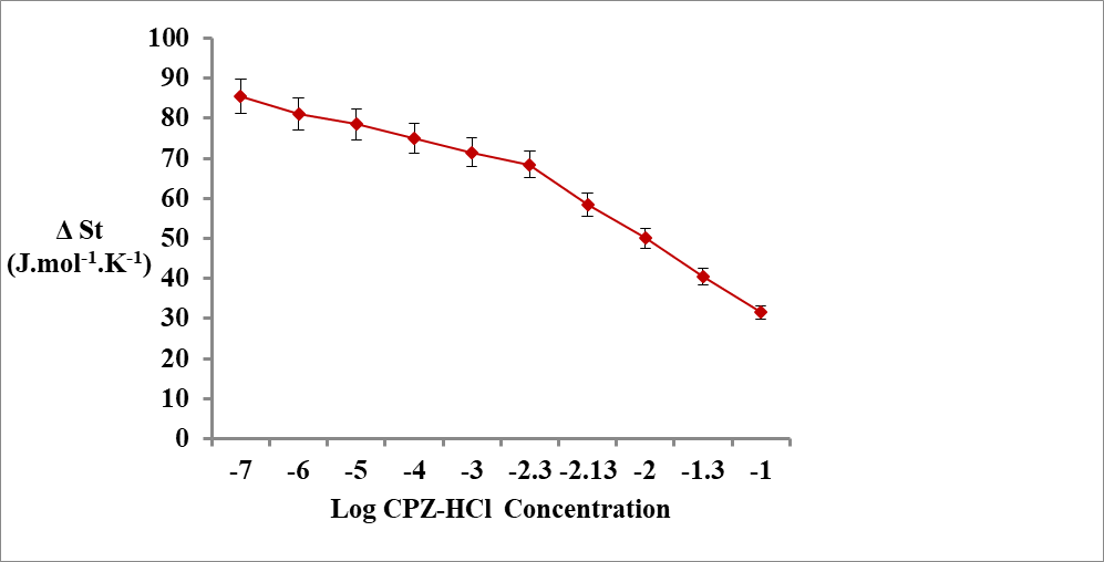 Fig. 3: Changes in the entropies of transition (∆St) of 10% W/V DMPC liposomes as a function of log molar CPZ-HCl in phosphate buffer (pH6.0). The values obtained were the mean of three experiments (n= 3). SDs are shown as error bars and all values were in the range of+1.3-1.8