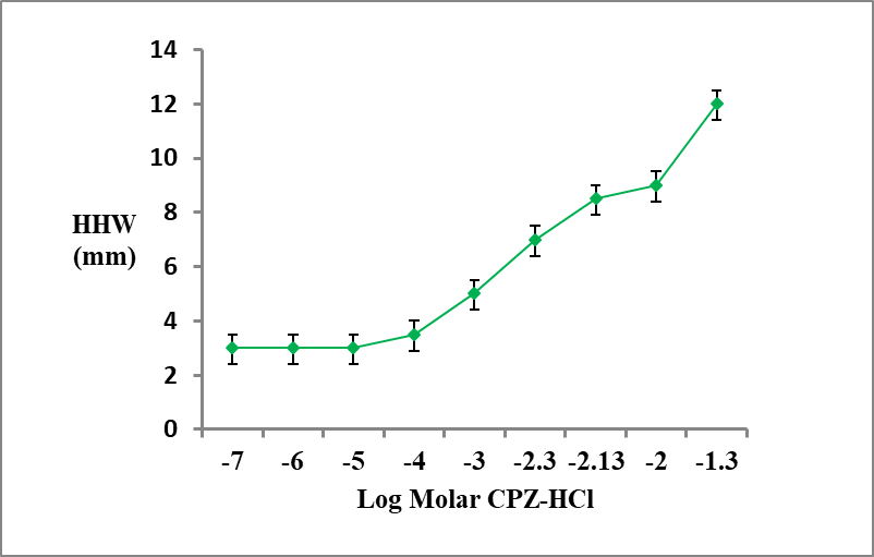 Fig. 4: Changes in the half-height width of DSC thermograms (HHW) of CPZ-HCl/DMPC (10% W/V) liposomes in phosphate buffer (pH 6.0). The values obtained were the mean of three experiments (n= 3). SD are shown as error bars and all values were in the range of +0.01-0.02