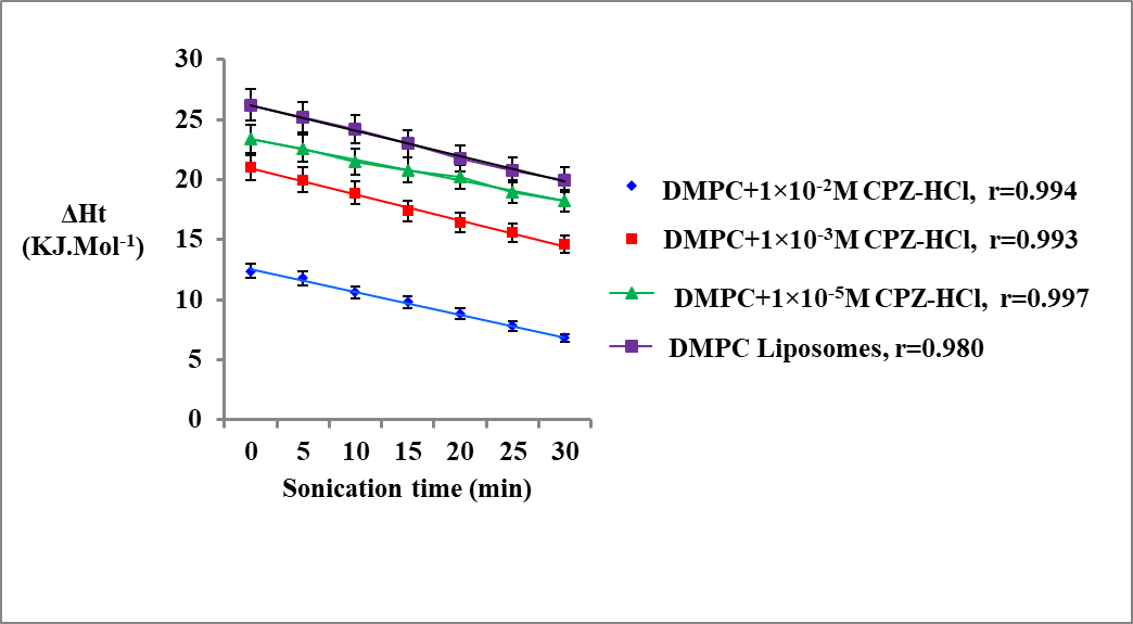 Fig. 5: The effect of sonication time on the enthalpies of transition (ΔHt) of 10% W/V DMPC liposomes in the absence and presence of CPZ-HCl in phosphate buffer (pH6.0). The values obtained were the mean of three experiments (n= 3). SD are shown as error bars and all values were in the range of+0.3-0.9