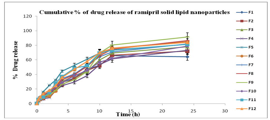 Fig. 3: In vitro drug release of REB-SLNs Error bars (mean±SD), n=3