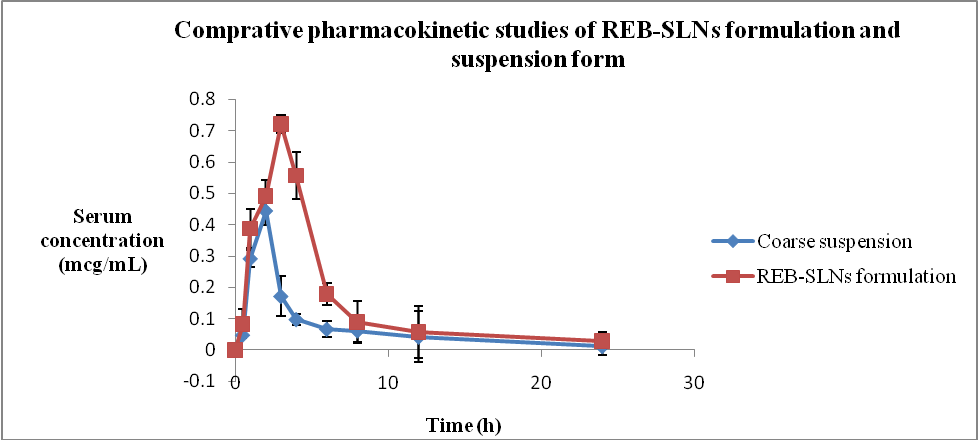 Compared to the coarse suspension, the bioavailability of formed REB-SLNs is higher. This higher bioavailability is due to either increasing the drug's aqueous solubility or increasing the drug's surface area available for release. When comparing the relative bioavailability of the REB-SLNs and the coarse suspension, the coarse suspension had a 3.87-fold increase in relative bioavailability. As a result of the development of REB-SLNs formulation, oral bioavailability could be improved shown in fig. 7.