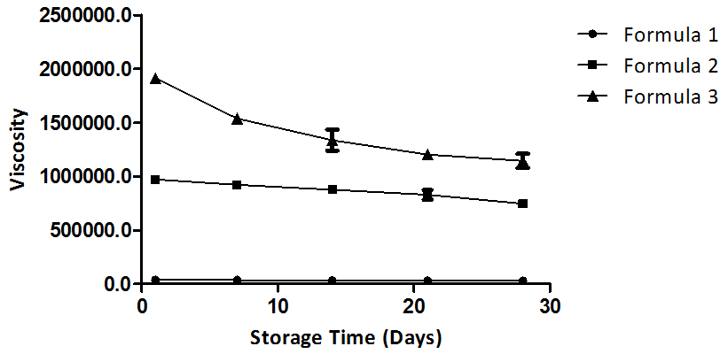 Fig. 1: Profile of relationship between storage time and viscosity, the value resulted from triplicate experiments