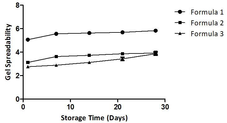 Fig. 2: Profile of relationship between storage time and gel spreadability, the value resulted from triplicate experiments
