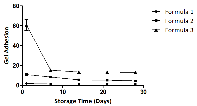 Fig. 3: Profile of relationship between storage time and gel adhesion, the value resulted from triplicate experiments