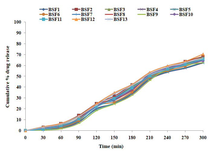 Fig. 2: In vitro diffusion of besifloxacin from reservoir formulations (BSF1 to BSF13)