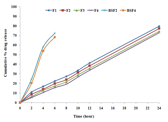 Fig. 9: In vitro diffusion of the ocular insert of Besifloxacin (sandwich between two rate-controlling membranes) and Reservoir formulation BSF2 to BSF4