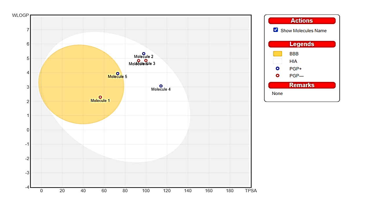 Fig. 1: This fig. represents secondarily screened 6 ligand molecules based on ADME properties. The white part of the BOILED-EGG Model represents the physicochemical space of molecules with the highest probability of being absorbed by the GI (gastrointestinal tract), while the yellow part represents the physicochemical space of molecules with the highest probability of permeating to the brain