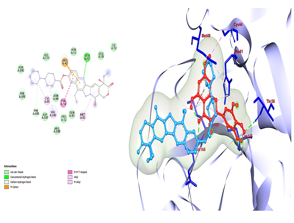 Fig. 2: Biovia discovery studio structural analysis of compound pubchem Id 60838 (sky blue) with receptor SARS-CoV-2 3CL Protease (violet) along with the native ligand (red)