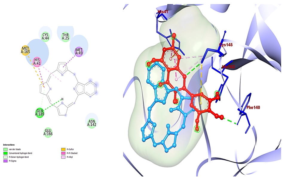 Fig. 3: Biovia discovery studio structural analysis of compound Pubchem Id 58823276 (sky blue) with receptor SARS-CoV-2 3CL Protease (violet) along with the native ligand (red)