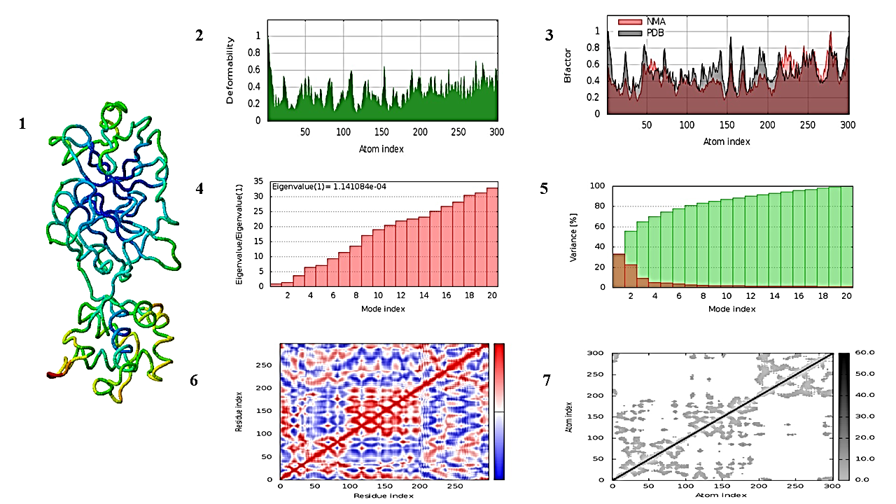 IMODs also measure the B-factor and structural deformity and calculate the eigenvalue. Image 1 represents the docked complex of our protein and ligand. Image 2 of the fig. represents the deformability graph. The deformity graph illustrated peaks in the graph, which represent regions in the protein with deformability. Image 3 represents the B-Factor graph. The main-chain deformability, also known as the B-Factor, is a measure of a molecule's ability to deform at each of its residues. Image 4 represents the eigenvalue of the complex. The motion stiffness is represented by the eigenvalue associated with each normal mode. Its value is proportional to the amount of energy required to distort the structure. The simpler the deformation, the lower the eigenvalue. Our docked complex demonstrated an eigenvalue of 1.4141084e-04. Image 5 represents the variance plot. The variance plot demonstrates individual variances in red color, whereas cumulative variance in green color. Image 6 represents the covariance map. This map demonstrates the correlation motion between a pair of residues in red color, uncorrelated motion in white color, and anti-correlated motion in blue color. Image 7 represents the elastic map of our docked complex. Each dot in the graph represents one spring inside the atoms' pair. The dots are colored dependent on stiffness, with darker grey dots indicating stiffer springs and lighter grey dots indicating softer springs. From the molecular dynamics study, it was evident that our complex showed a good amount of deformability. Furthermore, it also showed a moderately low eigenvalue, suggesting that it could be deformed easily. The variance map exhibited a higher degree of cumulative variances than an individual variance. The elastic network map also produced satisfactory results.