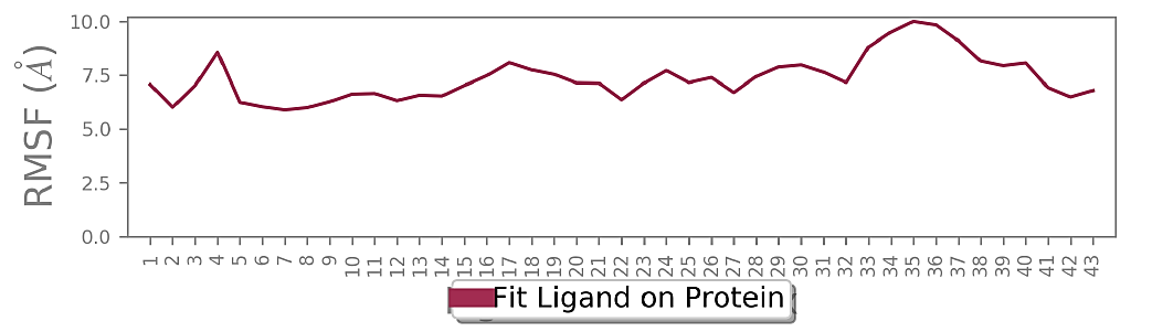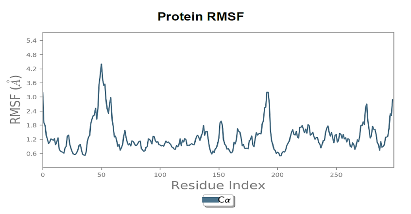 For MD Simulation using the Desmond program for our hit compound-receptor complex, the protein RMSD fluctuated between 2-18 ns but then showed a stable trajectory up to 50 ns. The ligand RMSD exhibited fluctuations from 0-12ns but then demonstrated a stable trajectory up to 50 ns (fig. 5). Regarding the Protein RMSF analysis, the highest fluctuation was observed at 4.2 Å. Overall, the Protein and Ligand RMSF trajectories were found to be stable (fig. 6, fig. 7). Other than these, the amino acid interactions of our protein-ligand complex were also analyzed. The notable hydrogen interactions were observed at PRO52, ARG188. The notable hydrophobic interactions were observed at ARG40, ILE43, TYR54, LEU57, LEU58, HIS80, MET82, ARG188. Water bridges were observed in ARG40, ASP48, MET49, ASN51, PRO52, TYR54, MET82, ASP187, ARG188, GLN199. Among these residues, only TYR54 and HIS80 exhibited strong interactions throughout the entire simulation process (fig. 8, fig. 9, fig. 10). Other than this, other ligand properties of the hit compound such as radius of gyration, molecular surface area, intramolecular hydrogen bonds, solvent accessible surface area, and polar surface area were monitored throughout the 50 ns simulation process (fig. 11). The radius of gyration, molecular surface area, and polar surface area plots of the hit compound demonstrated stable trajectories throughout the entire 50 ns simulation study. The solvent-accessible surface area plot showed slight fluctuations up to 15 ns but still showed a stable trajectory throughout the rest of the simulation process. Furthermore, the intramolecular hydrogen bond plot of the hit compounds demonstrated zero hydrogen bonds.