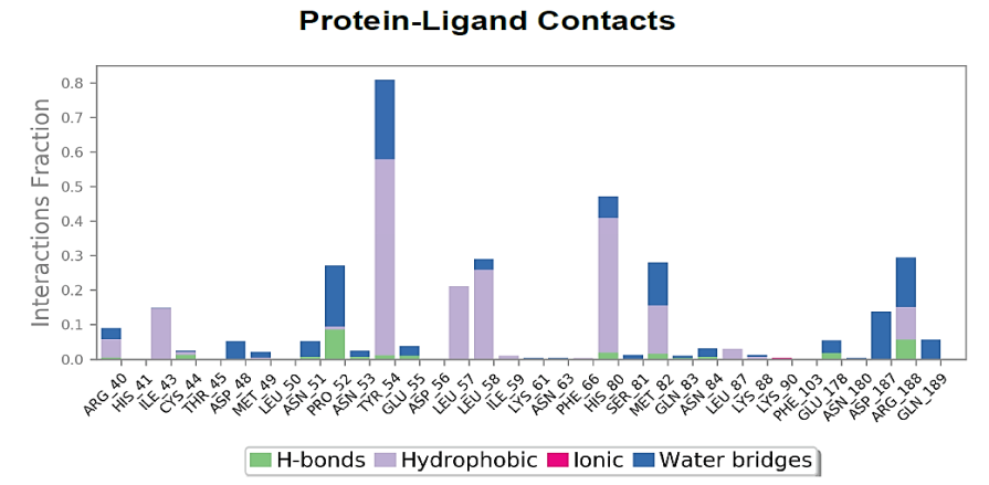 Fig. 8: Protein-Ligand contacts plot detailing amino acid interactions concerning interaction fraction