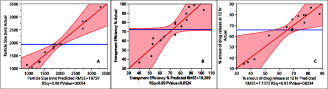 Fig. 2: Prediction plot shows Rsq based on the response of CMA, CPP on CQA like (A) Particle size (µm); (B) Entrapment efficiency (%); (C) % amount of drug release (ADR)