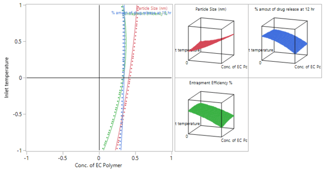 The selected pre-optimized attributes were fixed in Box behnken optimization design (BBD) as shown in table 2, was designed with the help of JMP QbD software. 15 formulation runs were generated. BBD of Response Surface Methodology with 15 formulation runs was used to determine the effects of changes in the Critical Quality Attribute (CQA) like Particle size (nm), % Entrapment Efficiency, % amount of drug release at 12 h corresponding to the Critical product and process parameter like Concentration of EC (Thickness of the coat), Inlet temperature, Atomizing air Pressure. In this optimization QbD design, the implementation of a first-order response surface model and elucidation of the effect outcome was based on a box-behnken design. Selected CMA and CPP from pre-optimization parameters are given as X1 for Concentration of EC; X2 for Inlet temperature in degree celcius; X3 for atomizing air pressure (kg/cm2) at 3-different levels code as low (-1), medium (0) and high (+1). By using the above attributes, the Pulsatile pellets was formulated and determined the effect on CQA like Y1-particle size in mm, Y2-% Entrapment efficiency and Y3-% amount of drug release [23, 24].