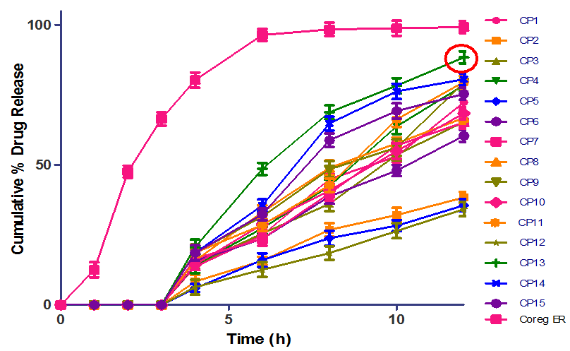 The drug release profile for Carvedilol pulsatile pellets was investigated in phosphate buffer (pH 7.4) by packing in a gelatin capsule. It shows that particle size decreased, the surface area increased, allowing more dissolution of the drug from the pellets. The release of drugs from the pellets mainly depends on polymer concentration. When the concentration of polymer increased with the formulation resulted in smaller micron-sized particles were formed, this resulted in the enhancement of the dissolution profile of carvedilol. Thus, the carvedilol release from CP13 Pulsatile pellets was found to be higher (88.4±2.8%) at 12 h than other formulations and marketed Coreg-ER tablets as shown in fig. 6. With an increase in the polymer concentration in CP13, the release of the drug was controlled well leads to a cumulative increase in the percentage amount of drug release, and the successful distribution of the drug is partly due to the size of the microparticles and the viscosity of the polymers, which makes for a higher rate of drug release into the aqueous medium.