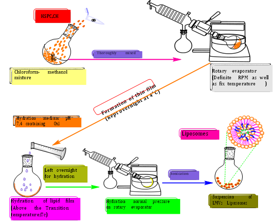 Liposomes were formulated by the thin-film hydration method reported by Bangham et al. and Mezei and Gulasekhelam. In brief, HSPC and CH were dissolved in chloroform: methanol (3:1) in a round-bottomed flask. A thin film was formed on the inner sides of the flask by evaporating the solvent system at 45 °C by continuously rotating the round bottom flask for 40 min at 100 rpm using a rotary evaporator (Buchi type, York Sci Co., Bombay) under reduced pressure. The solvent was completely removed. OHP was dissolved in HEPES buffer (pH 7.4). The film was hydrated with the drug-containing HEPES buffer by vortexing the flask for 30 min to get multilamellar vesicles. The suspension was kept aside for 4-5 h for the complete swelling of the liposomes. It was sonicated for 5 min at 4±1 ℃. The liposomes were passed through Sephadex G-50 columns to remove the unentrapped drug [11, 12].