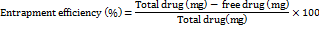 The entrapment efficiency of prepared liposomes was estimated by separating the unentrapped drug with the help of Sephadex G-50 minicolumn by centrifugation technique [16]. Sephadex G-50 (1.0 g) was allowed to swell in 0.9% NaCl at 25 °C with shaking, for 4 h, leading to the gel formation. It was stored at 4 °C and filled in minicolumn. Liposomes were added to the prepared column and centrifuged at 2000 rpm for 2 min. The separated liposomes were lysed using 0.1% Triton X-100 and filtered via a 0.2-micron membrane filter. The filtrate was assessed for drug content using HPLC (Shimadzu Corporation, Kyoto, Japan) employing 0.15 mol/l sodium dodecyl sulphate (SDS)/6% (v/v) pentanol mobile phase at a detection wavelength of 325 nm. The experiment was performed in triplicate [17]. The percentage entrapment efficiency was calculated using the following formula: