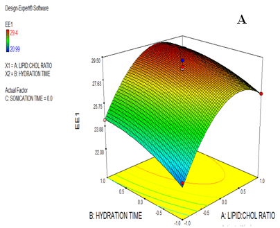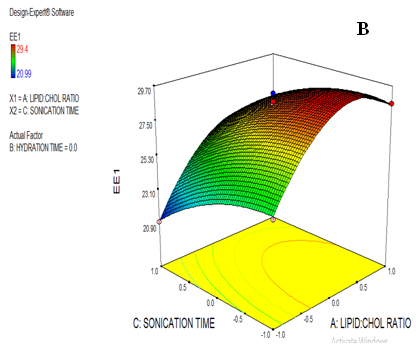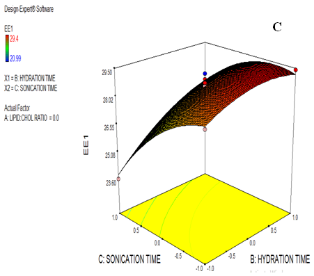 Fig. 3: (A–C) shows the 3-D response surfaces for Entrapment efficiency (EE) of OHP