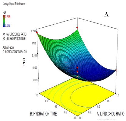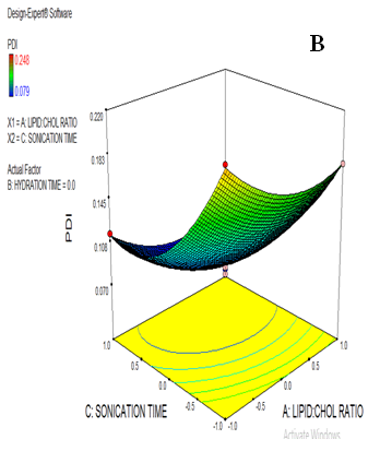 Systematically DoE optimization principle was implemented by response surface methodology (RSM) for analyzing second-order polynomial models, using various feasible experimental runs. With the help of Design-Expert® software (10.0, Stat-Ease Inc., Minneapolis, USA) and 3-factors, 3-levels BBD was utilized for analyzing the effect of independent variables i.e. Molar ratio of HSPC: Chol (X1), Hydration time (X2), and sonication time (X3) to estimate the 3-D response surfaces by scrutinizing the effect of independent variables on selected dependent variables i.e., percent entrapment efficiency OHP (Y1), polydispersity index (PDI) (Y2) and vesicle size (Y3). All independent variables are shown as+1, 0, and-1, which portray high, medium, and low levels, respectively (table 1). All the independent and dependent (response) variables have been outlined with their coded and decoded levels in table 1. In the design matrix 17 runs were produced on Three-level, Three-factors (table 2). Few model parameters such as multiple correlation coefficient (R2), adjusted multiple correlation coefficient/(adjusted R2), predicted multiple correlation coefficient (predicted R2), coefficient of variation (CV), and predicted residual sum of the square were estimated and compared to explore the generated model. The response surface analysis (RSA) was carried out by 3D response surfaces (fig.) using Design-Expert® software (10.0, Stat-Ease Inc., Minneapolis, USA). 3D response surface plots help to establish desirable responses and operating conditions. They usually display a three-dimensional view that can impart a clear image of the response. These 3D surface plots aid the experimenters to comprehend the nature of the relationship between the factors and the responses [14].