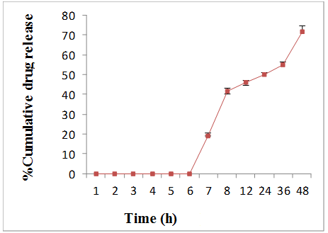 The cumulative percentage of drug release from Eudragit coated beads is shown in fig. 7. It was found that there was no drug release up to 6 h; it started releasing the drug after the completion of 6.5 h when these beads came in contact with simulated intestinal fluid pH 6.8. There was no drug release in the upper parts of GIT i.e. stomach and intestine from Eudragit S-100 coated beads since they were safeguarded in the upper GIT due to the Eudragit-S-100 coating which undergoes dissolution only at pH>6.8. The coating of the beads starts dissolving after reaching the distal part of the small intestine and the polysaccharidase enzyme present in the colon digests the uncoated alginate beads leading to the release of the entrapped liposomes. At the end of 48 h, 71.6% of oxaliplatin was released from the liposomes. The results attained are concordant with those obtained by Chaurasia et al. 2007. They prepared guar gum microspheres bearing methotrexate and reported that maximum drug release was observed after 7 h, which is due to the digestion of guar gum by the colonic microflora [28].