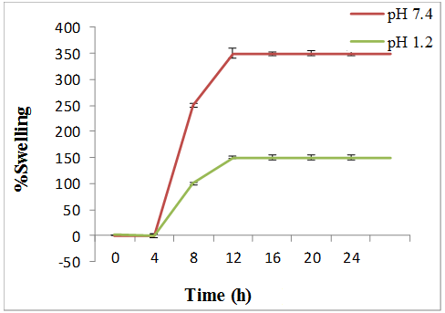 Fig. 8: Determination of % swelling of alginate beads at pH 1.2 and pH 7.4. Results are presented as mean±SD, n = 3