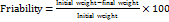 The friability test was performed using a friabilator to assess the tendency of the tablet to chip, crumble or break upon handling or compression as well as the strength of the tablet. A sample of a preweighed tablet is put in the friabilator (Erweka Friabilator tester). The friabilator was operated at 100 rpm [10]. The weight of the tablet was determined before and after a specified number of revolutions so the weight loss can be determined. Tablets are considered acceptable if the percentage of weight loss lies within the range of 0-1% of tablet weight. The percent friability can be determined using the following equation: