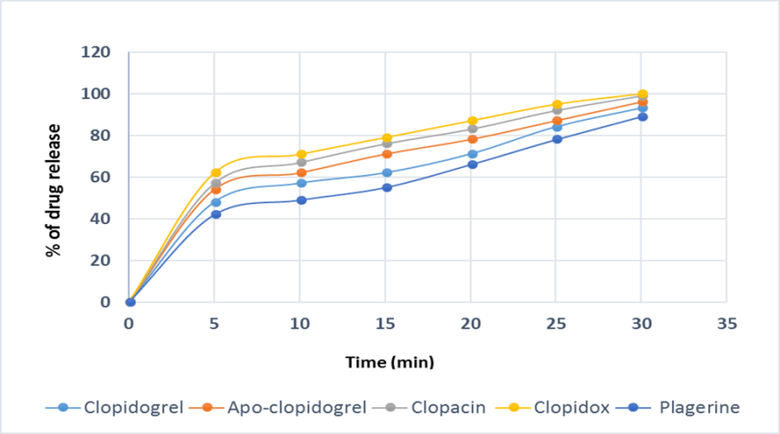 Clopidogrel bisulfate bioavailability of oral film-coated tablets is based on the dissolution of the drug. So, it is essential to determine the dissolution rate and make a comparison to the dissolution profiles of clopidogrel bisulfate oral tablets marketed by different companies. Depending on USP, the dissolution profile of conventional oral tablets within one hour should be at least 80%. In this study, plots of in vitro release showed that all products of clopidogrel bisulfate manufactured by different companies meet USP limitations. That means the release was more than 70% within 25 min. Fig. 4 revealed that the clopidox batch released a higher amount of drug (99.98%), while the plagerine batch released less amount among different batches (89.21%).