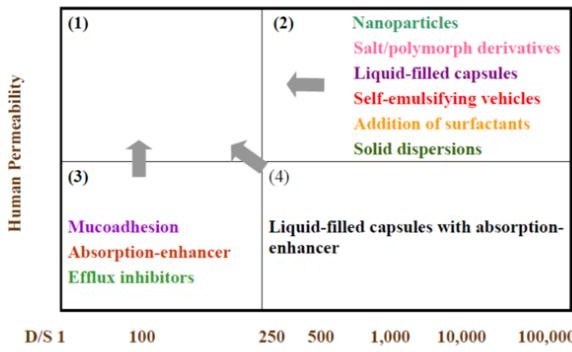 This graph demonstrates some of the initiatives taken to increase the solubility and permeability of active medicinal ingredients. Nanoparticle creation, salt derivatization, solid dispersion formation, surfactant addition, emulsion, and soft capsule formation are all possible in BCS class II. Additional excipients, such as mucoadhesives, and enhanced absorption, can be added to class III BCS. It is feasible to add absorption-enhancing excipients and convert the formulation into soft capsules in addition to in-class IV BCS [8].