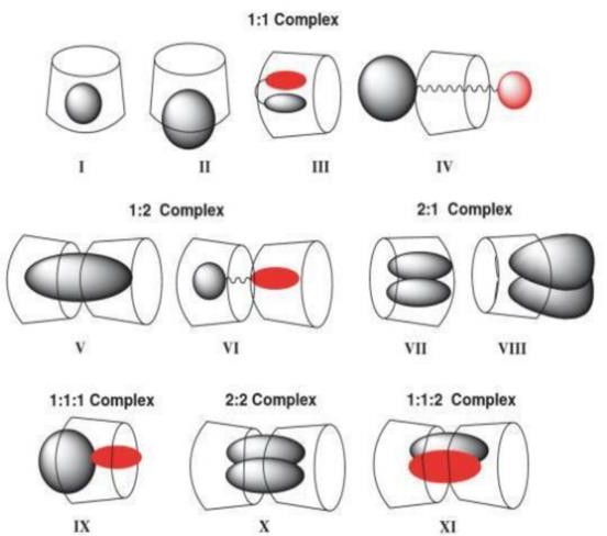 Fig. 2: Types of inclusion complexes between the active drug substance and cyclodextrins [19]