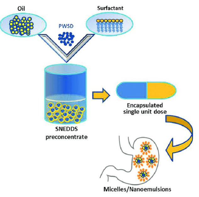 SMEDDS (self-micro-emulsifying drug delivery system) and SMEDDS (self-nano emulsifying drug delivery system) are two forms of SEEDS formation processes (SNEDDS). Microemulsions and nanoemulsions are the only two varieties that differ in size. The goal of this method is to make medication molecules more soluble in oil. Oil molecules are made up of nano or micro-sized droplets that are coated with surfactants or co-surfactants to increase their solubility in the aqueous phase while also increasing and facilitating absorption in lipid membranes (such as the intestine). This method has been shown to have a higher solubility (about 87% for 30 min) than powder dosage forms [18].