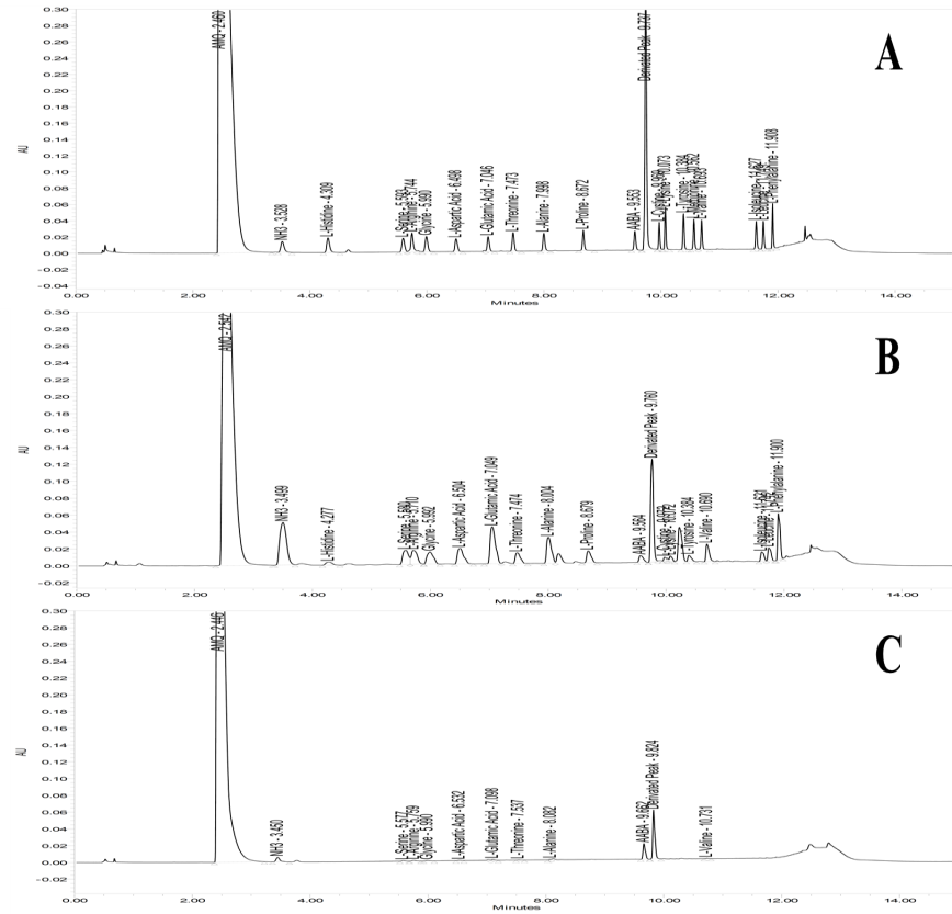 Fig. 1: UPLC chromatograms of amino acids in (A) reference standard (B) Moringa leaf extract and (C) Moringa leaf extract-loaded phytosomes