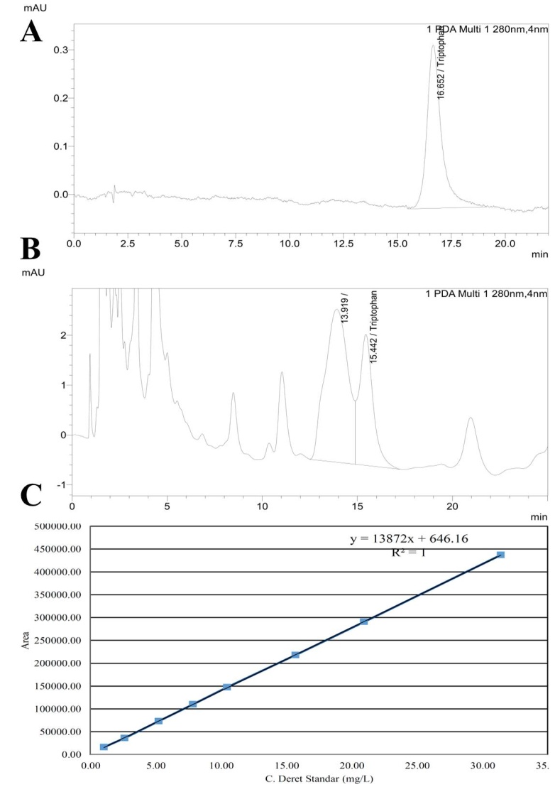 The tryptophan was analyzed using High-Performance Liquid Chromatography (HPLC). The L-tryptophan standard solution used 25 mg standard L-tryptophan mixed with 10 ml double-distilled water and 0.3 ml hydrochloric acid and sonicated for 15 min then diluted in 25 ml of double-distilled water. Stock solution 1 ml was added with 10 ml of double-distilled water and mixed well. The working standard solutions made using eight concentrations levels were prepared from the stock solution for the calibration curve. A total of 1 g samples into a vial and added 10 ml sodium hydroxide and vortexed immediately. The sample was hydrolyzed in an oven at 110 ℃ for 22 h. Let cool at 25 ℃. Hydrolysate added 3 ml citrate buffer solution and adjusted with hydrochloric acid or sodium hydroxide until pH 4.25. The mixture was diluted with 50 ml of double-distilled water and mixed well. Transfer to 2 ml of centrifugal tube and centrifuge at 14000 rpm for 3 min. Supernatant filtered by using a 0.45 µm syringe filter into a vial. A total of 15 μl of standard or the sample was injected into the HPLC column (Shimadzu Prominence-i LC 2030, Germany) with a PDA and a C18 reversed-phase column. The mobile isocratic phase included sodium acetate (A) and methanol (B) at 1.0 ml/min at 37 °C [22].