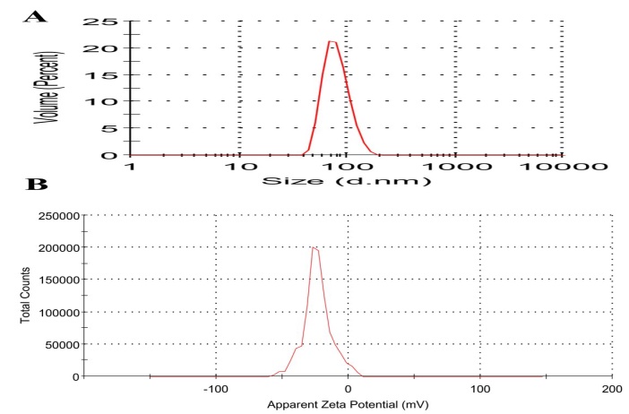 Fig. 4: Chromatogram in (A) particle size distribution and (B) zeta potential