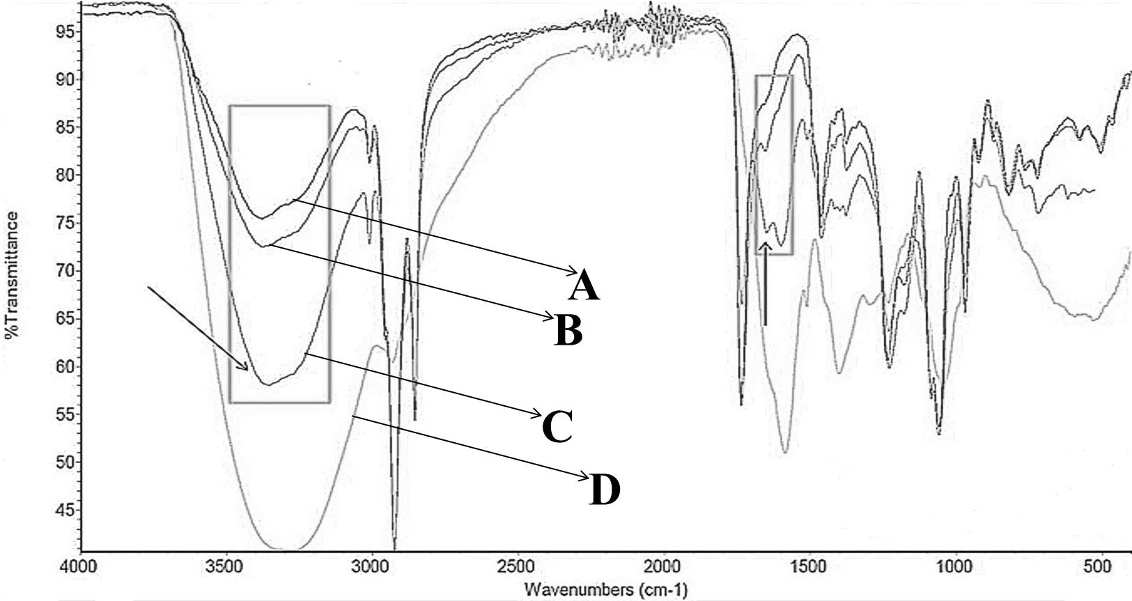 Fig. 5: FTIR spectra of (A) phospholipid (B) physical mixture (C) phytosomes (D) Moringa leaf extract, the boxes, and small arrows showed intensity changes also new peaks in the spectra of Moringa leaf extract-loaded phytosomes