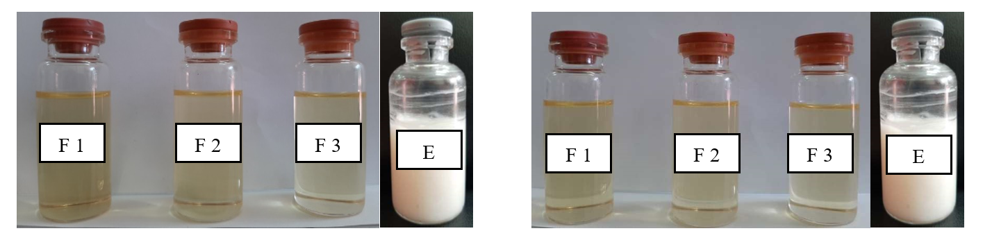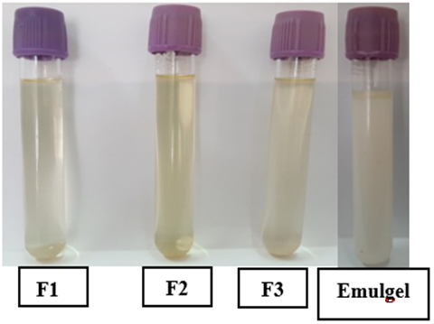 The result of the cycling test of nanoemulgel preparation did not find any phase separation (fig 3). There was phase separation in the emulgel preparation after the centrifugation test, but the physical form of nanoemulgel preparations did not change as shown in fig. 4.