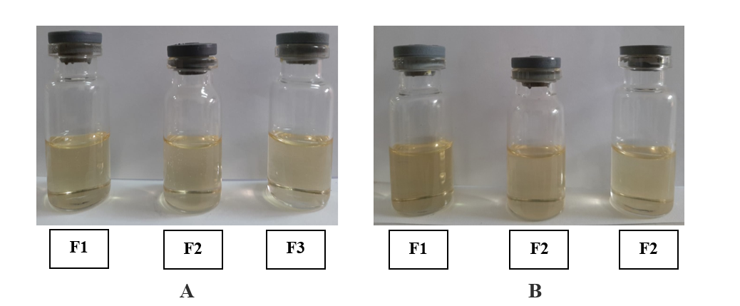 Fig. 2: Appearance of carrot seed oil nanoemulgels after storage for 12 w at low temperature (A) and high temperature (B)
