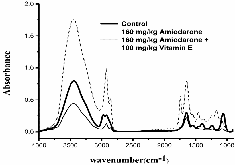 Fig. 1 shows the infrared absorption spectra of the control, amiodarone treated and Amiodarne+Vitamine E covers the frequency range 4000-900 cm-1. The main manifested feature of the spectra is that treatment with Amiodarone resulted in an increase in the intensity of the spectra compared to the control. On the other hand, coadministration of vitamin E accompanied amiodarone was associated with reduced absorption intensity relative to either the control group or Amiodarone one.
