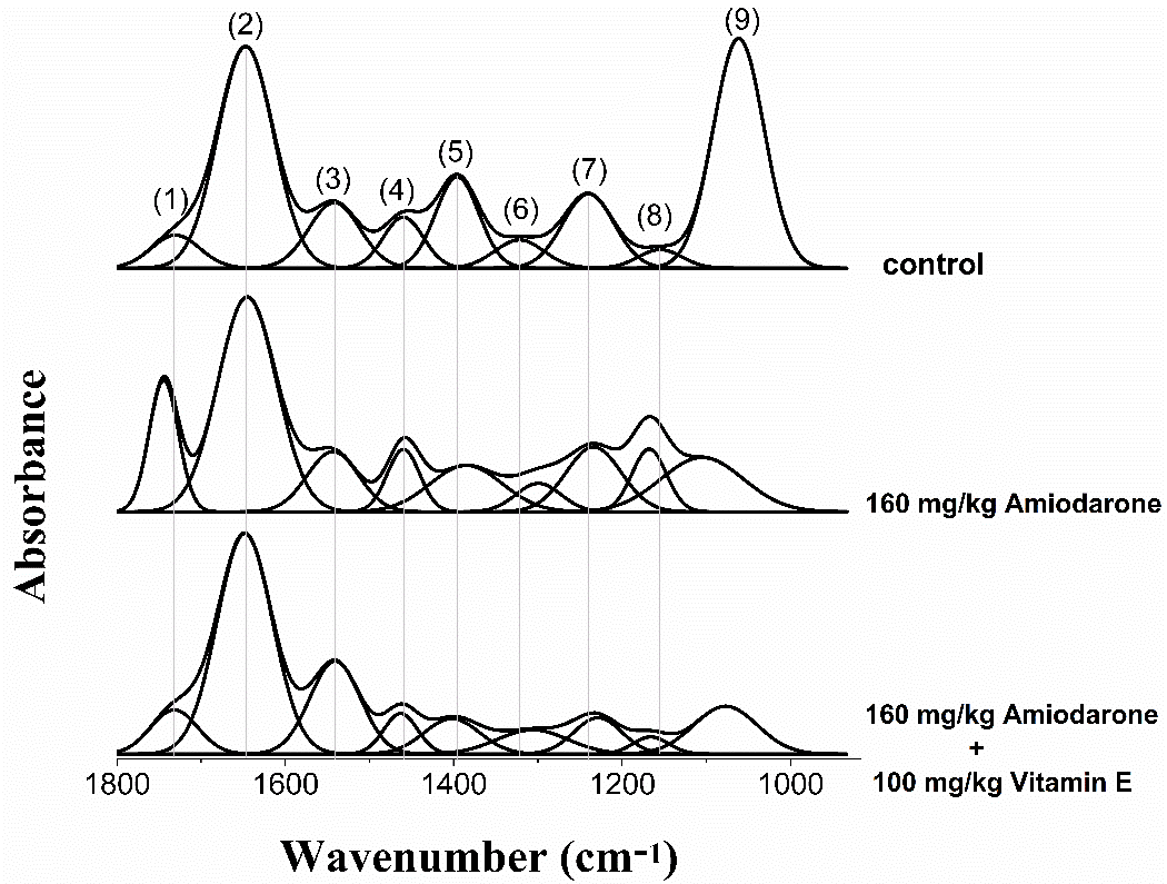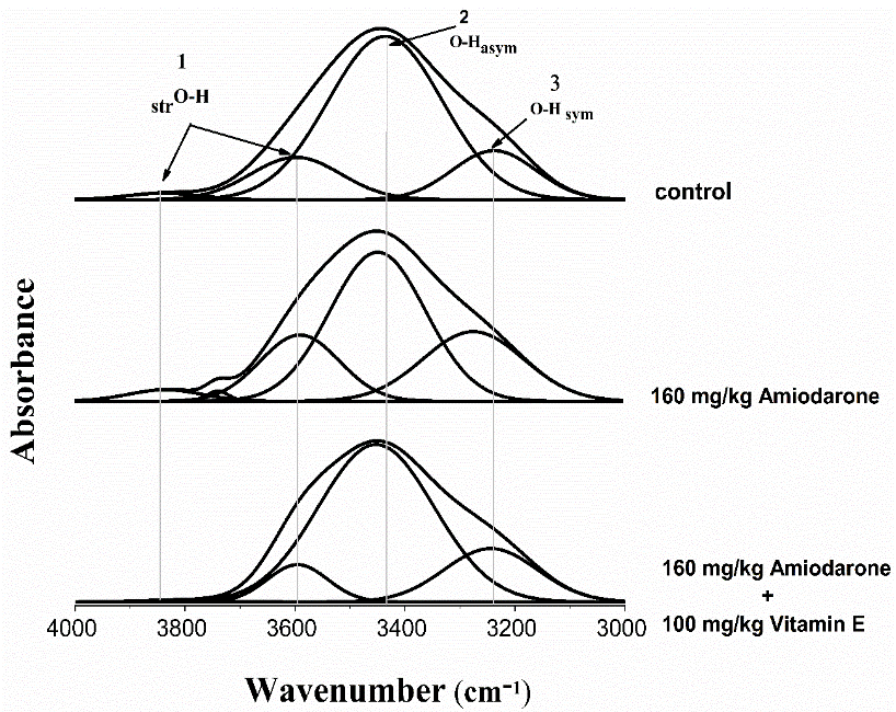 Co-administration of vitamin E with amiodarone reduced the contour to four components as control with the significant increase in the band position of O-Hasym and the bandwidth of one component of str O-H.