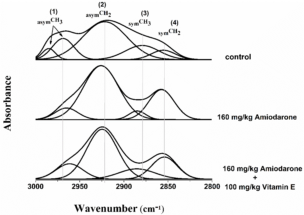 The area ratio of asymCH2 to symCH2 was 7.93±0.03 in the control group, while the treatment with amiodarone reduced it to 2.51±0.1. Coadministration of vitamin E with amiodarone did not increase this ratio (2.70±0.05). Further, the area ratio of asymCH2 to asymCH3 was elevated from 2.72±0.4, in the control group, to 7.30±0.02 in the amiodarone-treated group, while the coadministration of vitamin E returned it to be 3.72±0.1. Finally, there was an increase in the absorption intensities of all bands of the CH stretched region (asymCH3, asymCH2, symCH3, and symCH2).